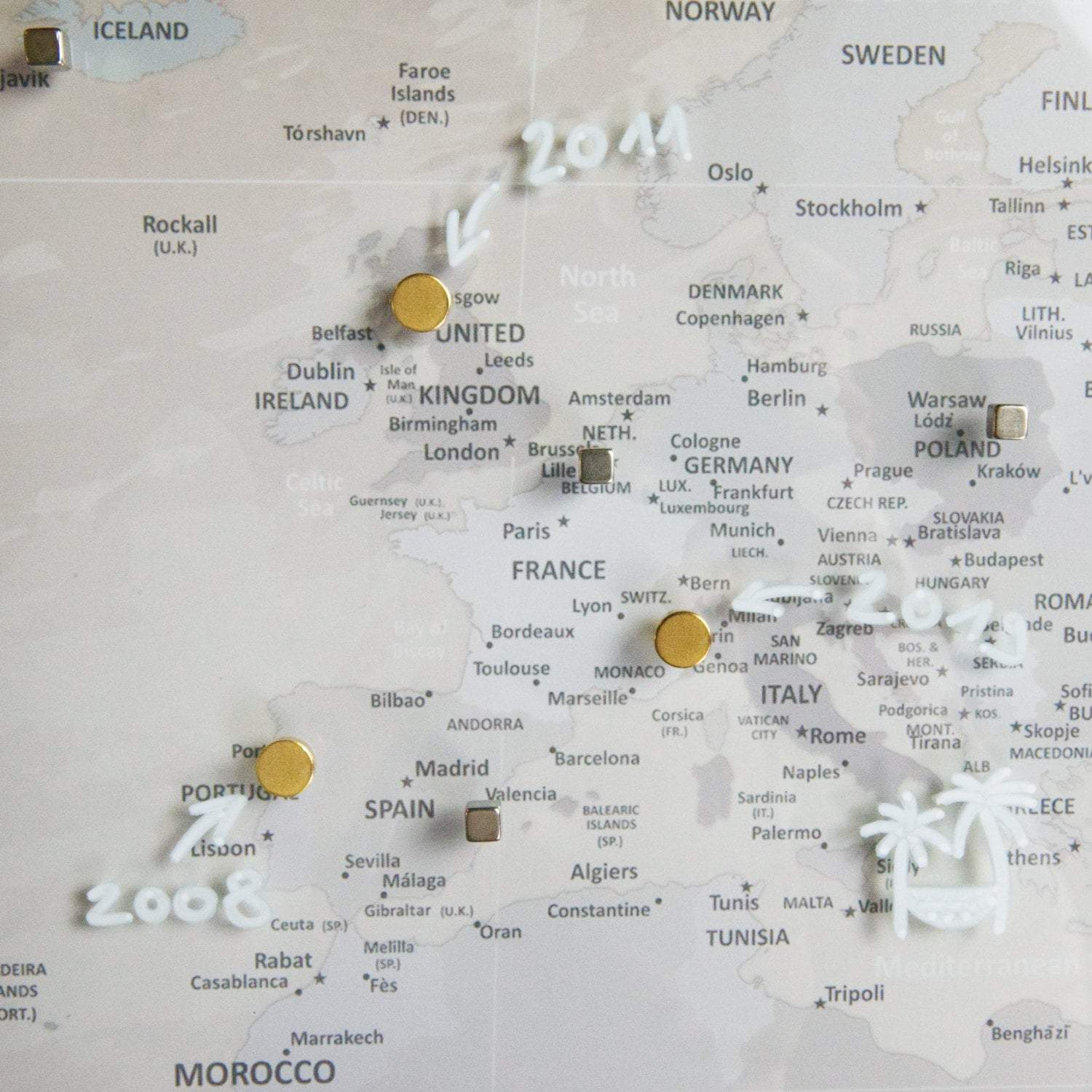✔ markiere Deine Reiseziele oder befestige Postkarten, Fotos oder andere Erinnerungsstücke