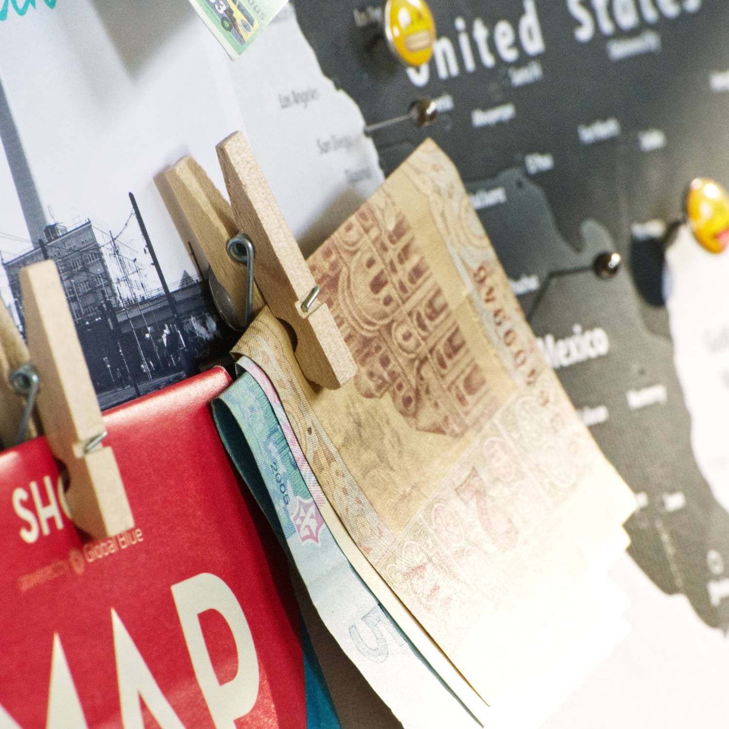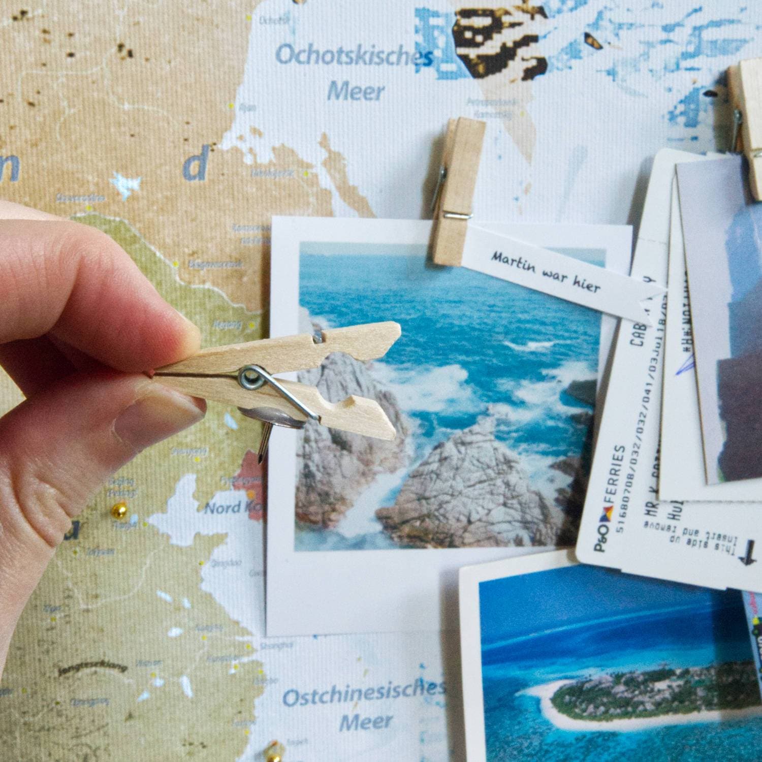 Nach Deiner Reise hat sich so einiges angesammelt - Eintrittskarten, Fotos oder der ein oder andere Scheine in der Landeswährung. Behalte Dir das Urlaubsflair noch etwas länger und nutze unsere Klammer Pinnadeln um Deine Erinnerung an Deiner Weltkarte zu befestigen. Versuche es und dekoriere Deine Weltkarte mit einer einzigartigen Collage. Und brauchst Du frischen Wind? Dann wechsle problemlos Deine Fotos oder Notizen aus - klasse 🤩