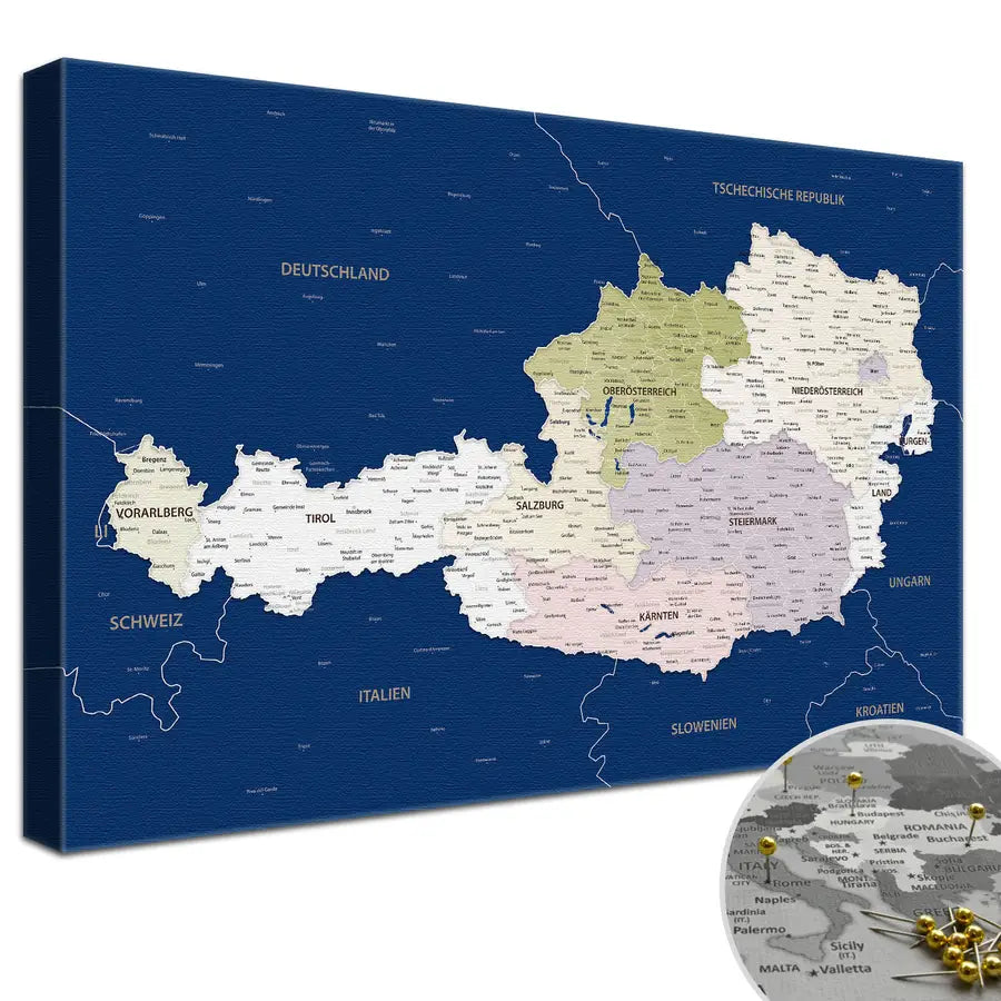 Leinwandbild - Österreichkarte Blau - Pinnwand