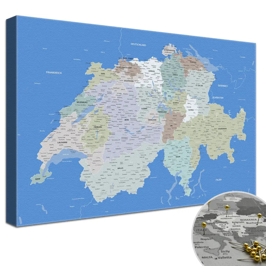 Leinwandbild - Schweizkarte Hellblau - Pinnwand