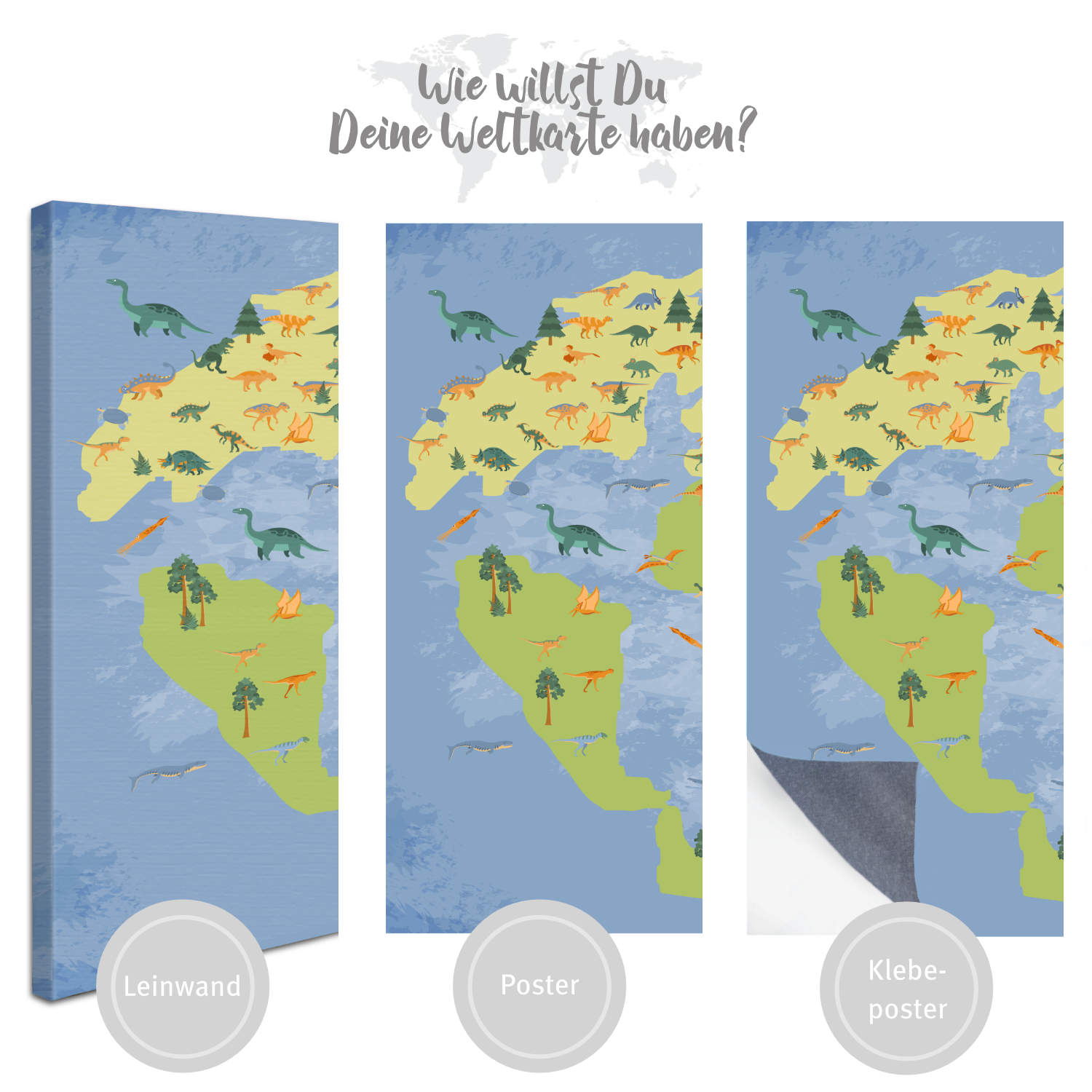 Weltkarte mit Dinos fuer das Kinderzimmer auf Leinwand