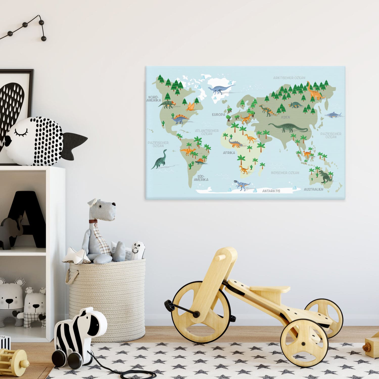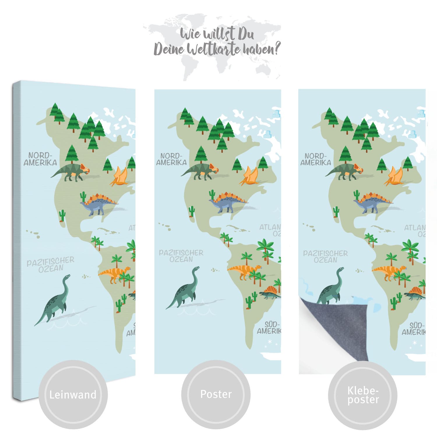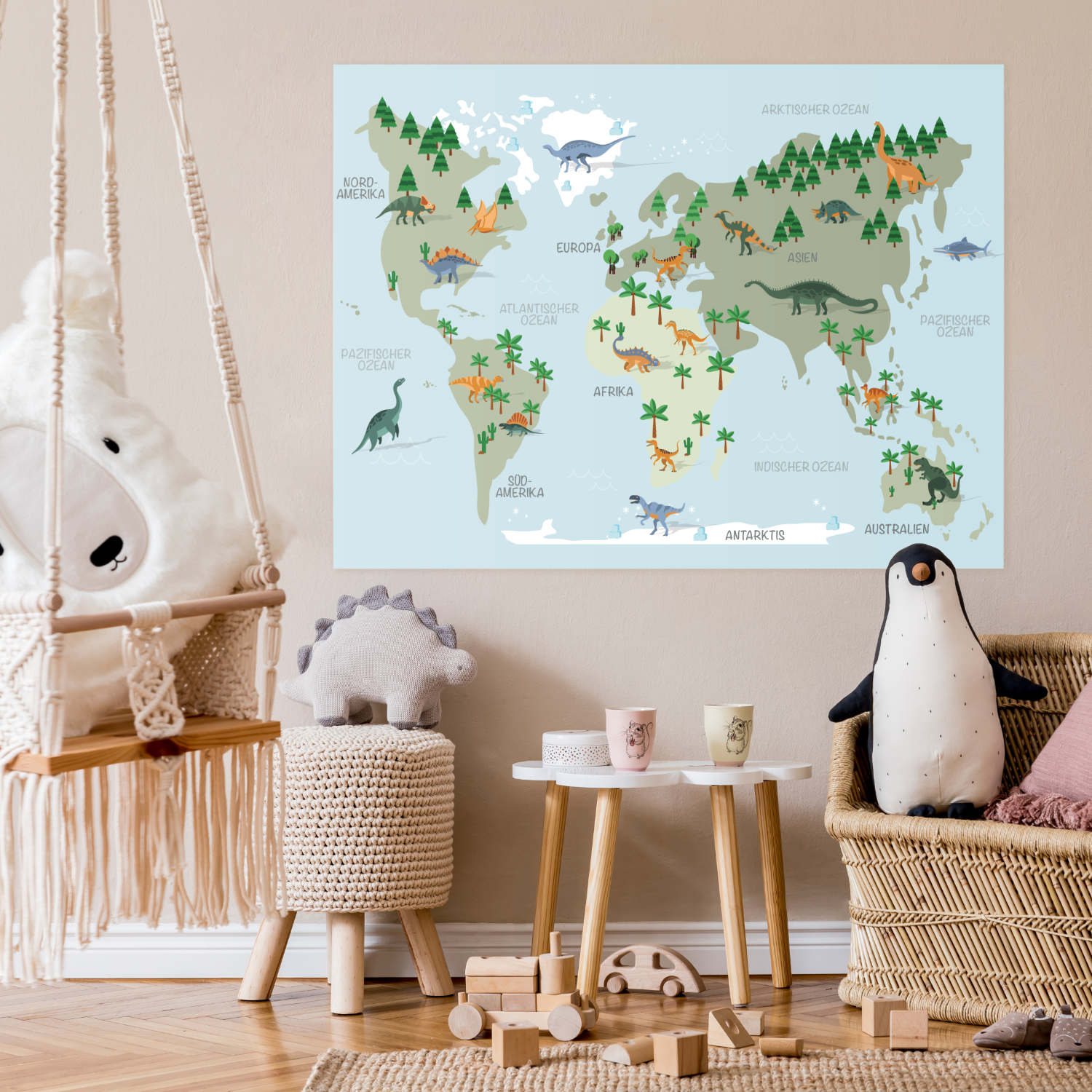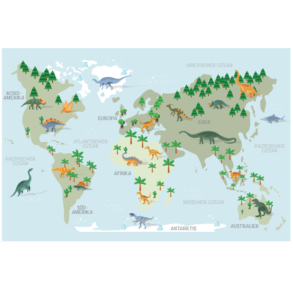 Weltkarte Kinder Hellblau - Dinosaurier, Deutsch