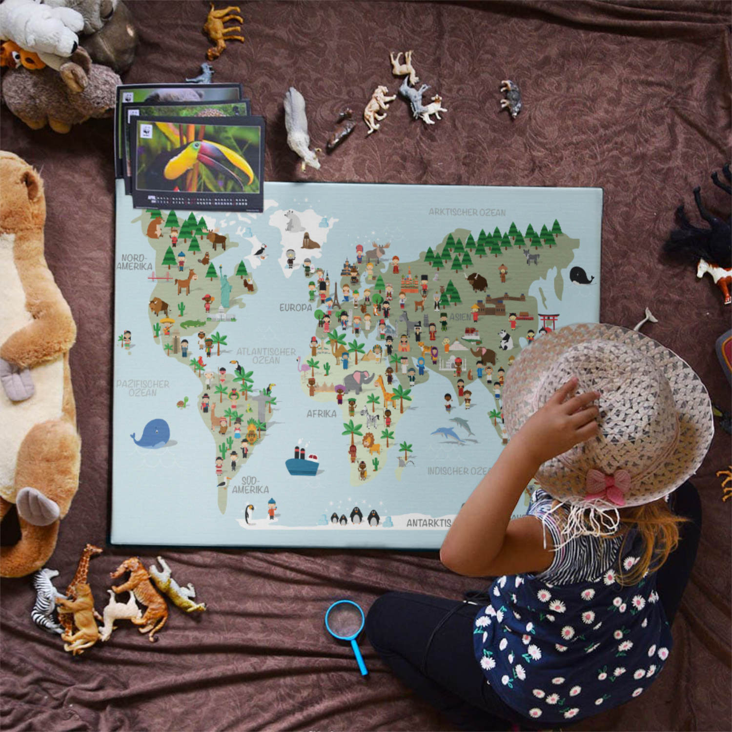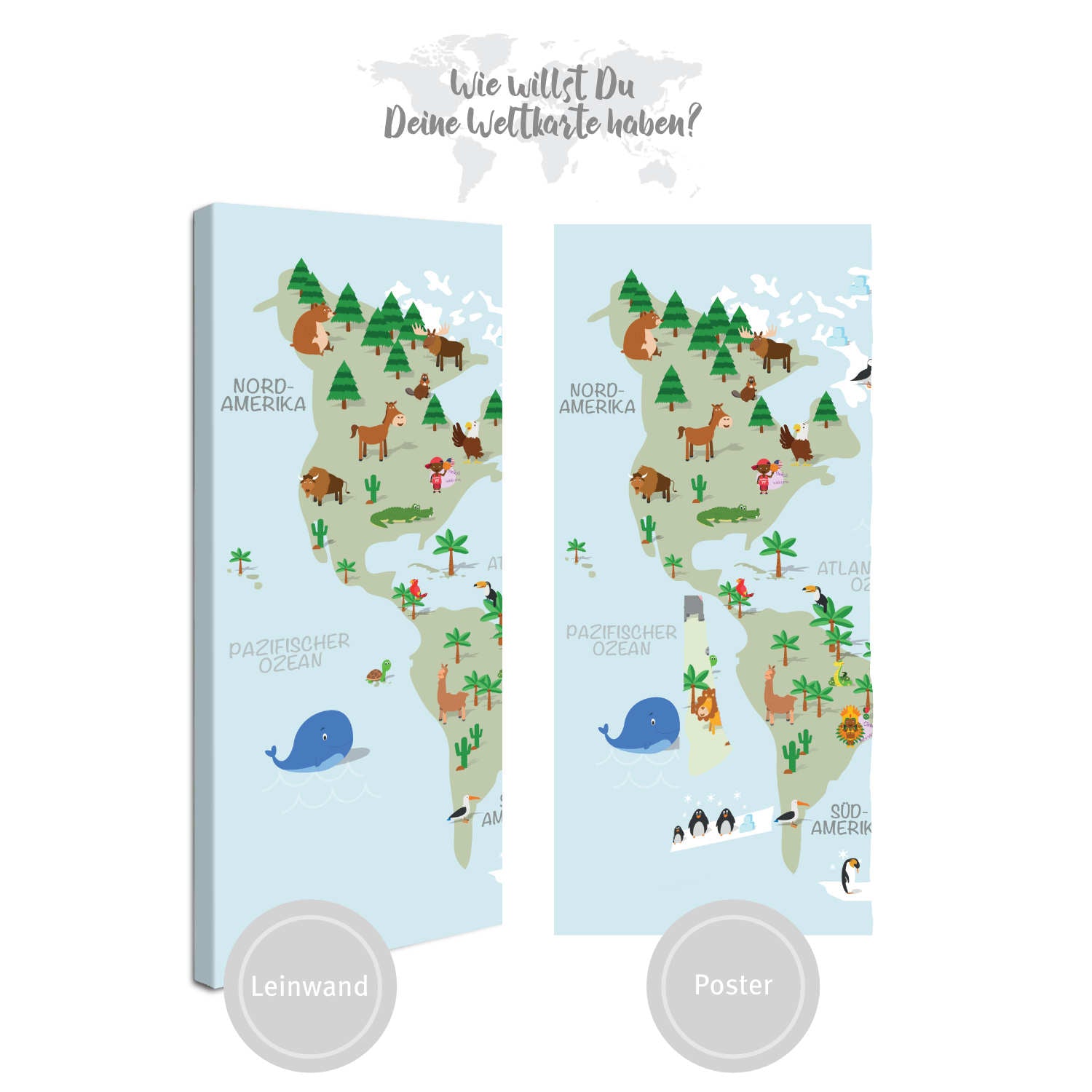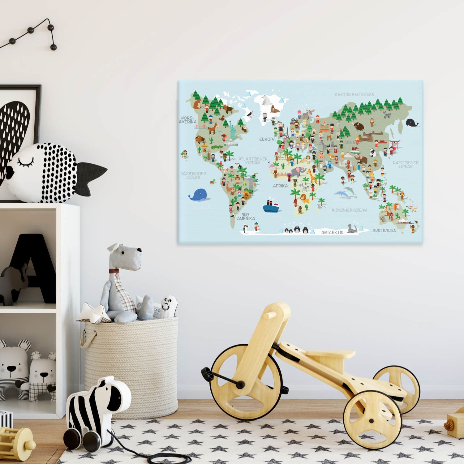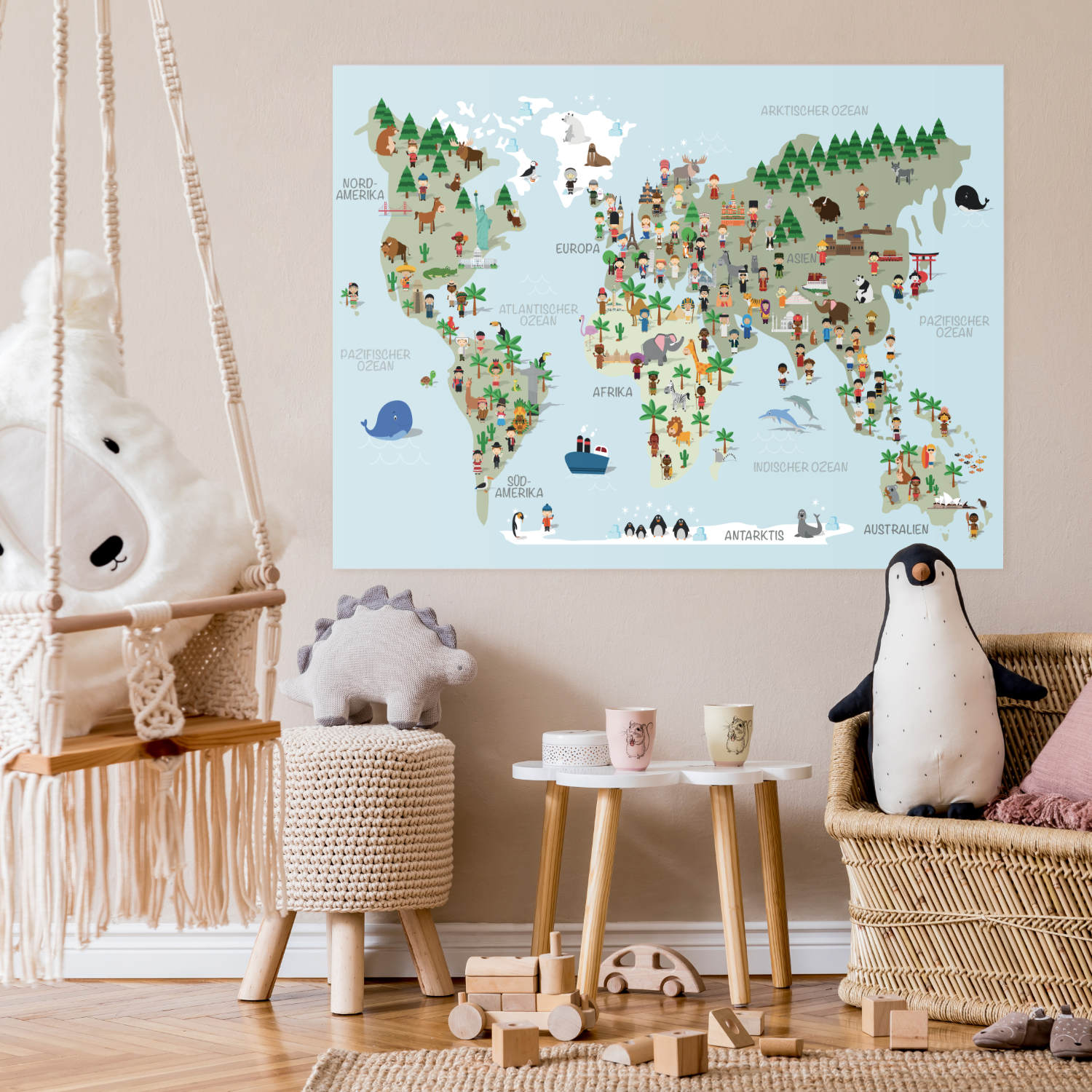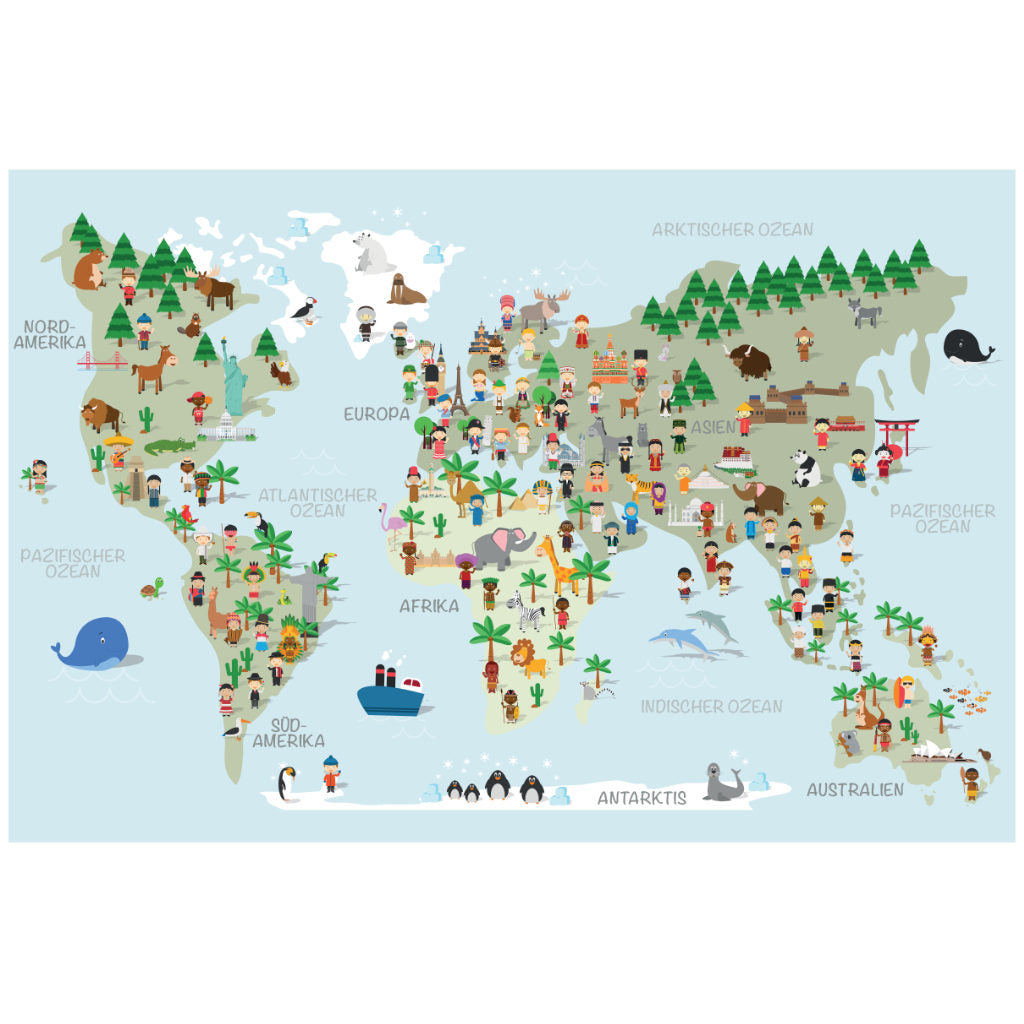 Weltkarte Kinder Hellblau - Tiere, Menschen, Sehenswürdigkeiten, Deutsch